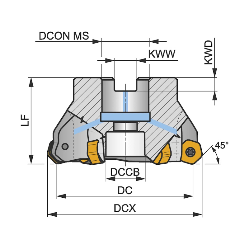 HN09 45° face mill with double negative geometry which utilises HN.. 06.... or XN.. 06.... double-sided inserts. Through coolant and differential pitch for face milling, ramping, progressive plunge milling and chamfering.