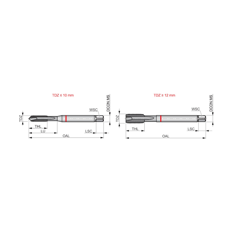 Spiral point tap Red Shark with chamfer form B with a 3.5-5xP second lead, for ISO-Metric thread and 6H class of fit, dimensions according to DIN 371 standard , powder metallurgical HSS-E with TiAlN-Top coating for 2.5xD through hole threading in plain carbon, alloy and tool steel