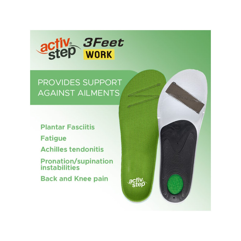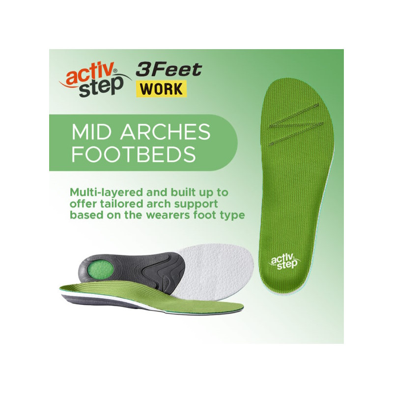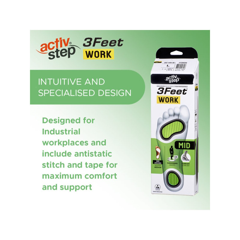 Activ-Step® 3Feet Work footbeds are designed to support common foot conditions which include: Plantar Fasciitis, Fatigue, Achilles tendonitis, Pronation/supination instabilities and Back and knee pain. They have been specifically designed for industrial workplaces and include anti-static stitching and tape for product assurances purposes. The footbeds are multi layered and built up to offered tailored arch support based on the wearers foot type. Size Breakdown: S = 4-5, M = 6-7, L = 8-9, XL = 10-11, XXL = 12-1