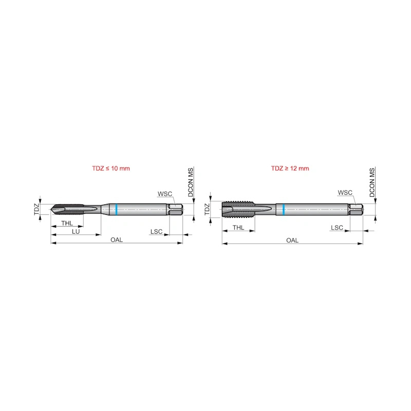 Spiral point tap Blue Shark with chamfer form B with a 3.5-5xP second lead, for ISO-Metric thread 6H class of fit, dimensions according to DIN 371 standard, powder metallurgical HSS-E with Super-B coating for 2.5xD through hole threading in ferritic, martensitic and austenitic stainless steel
