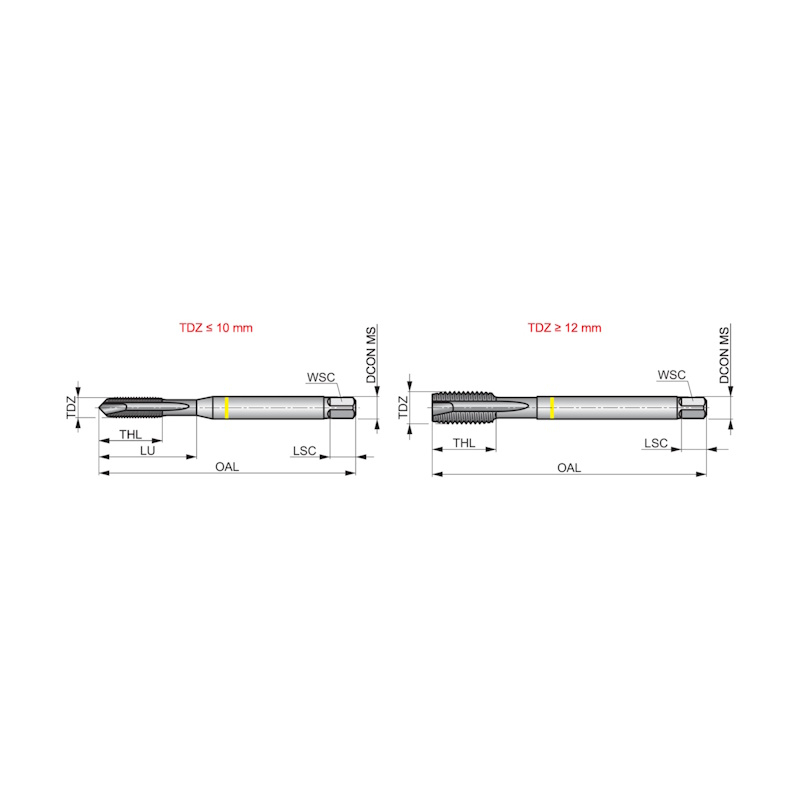 Spiral point tap Yellow Shark with chamfer form B with a 3.5-5xP second lead, for ISO-Metric thread 6H class of fit, dimensions according to DIN 371 standard , powder metallurgical HSS-E with flash chorme surface finish for 2.5xD through hole threading in free machining and plain carbon steel and copper or copper alloys