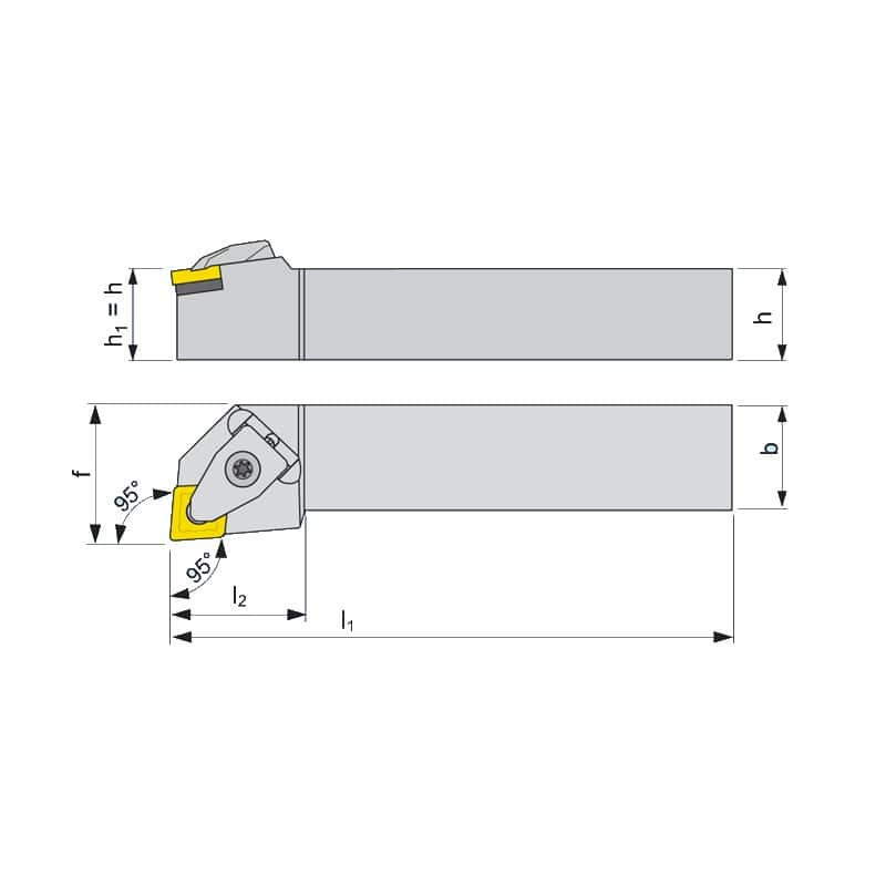 Double clamp turning tool for holding a 80° rhombus negative insert, right hand 95° side and end cutting with off-set shank,for taper turning, face turning with and without shoulder and longitudinal turning with and without shoulder
