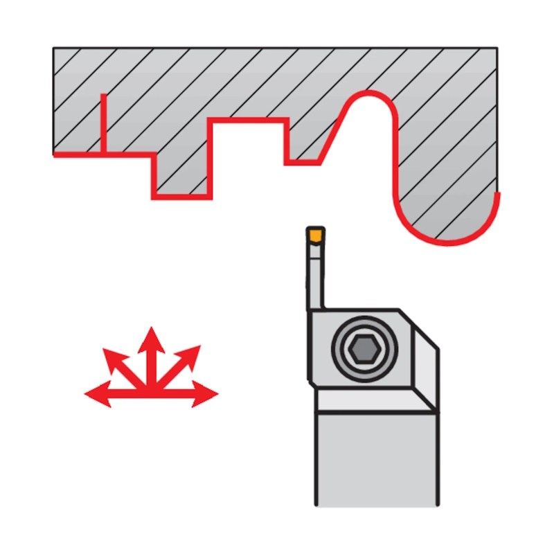 Top clamp grooving tool for holding a double or single ended insert with 3mm-8mm cutting width (designation LCM.. ), right and left handed with insert parallel to the shank for maximum parting diameter, shank height 20mm-32mm, width 20mm-25mm and tool length 125mm-170mm for multi-directional copy turning, shallow and deep radial grooving, radial groove turning, parting-off and tube parting-off