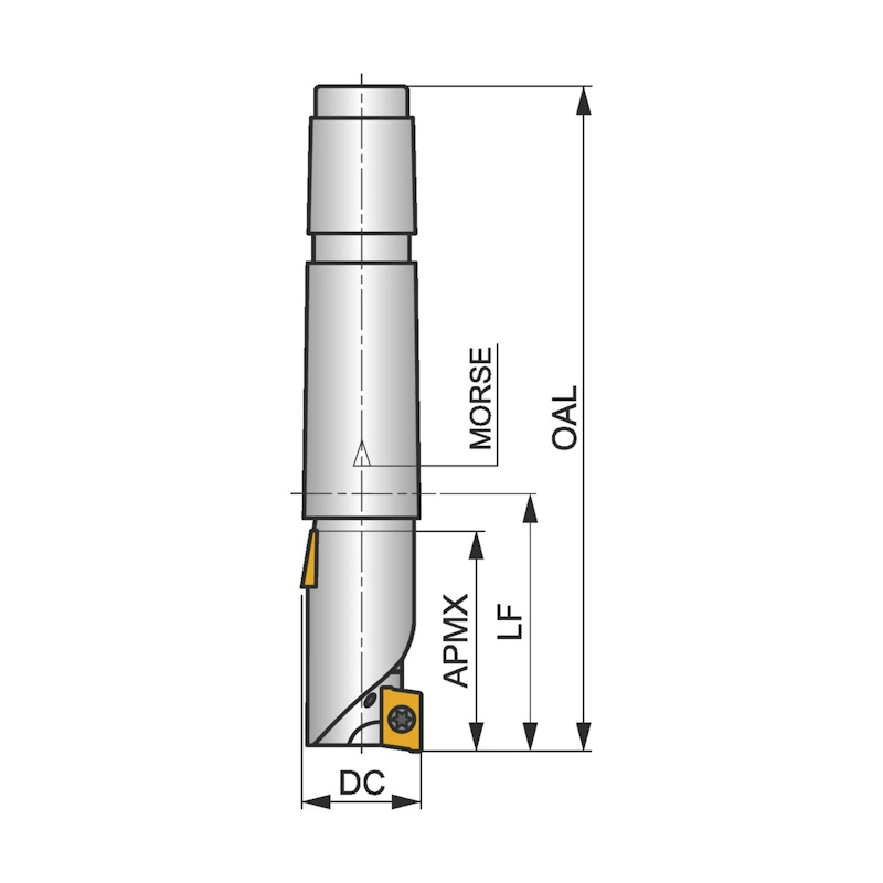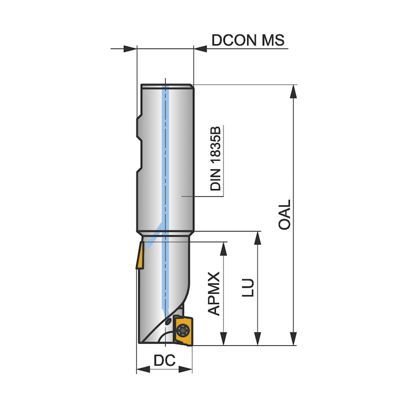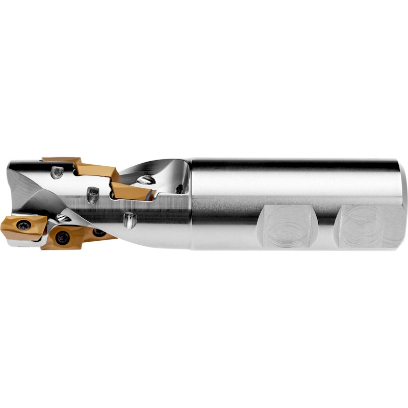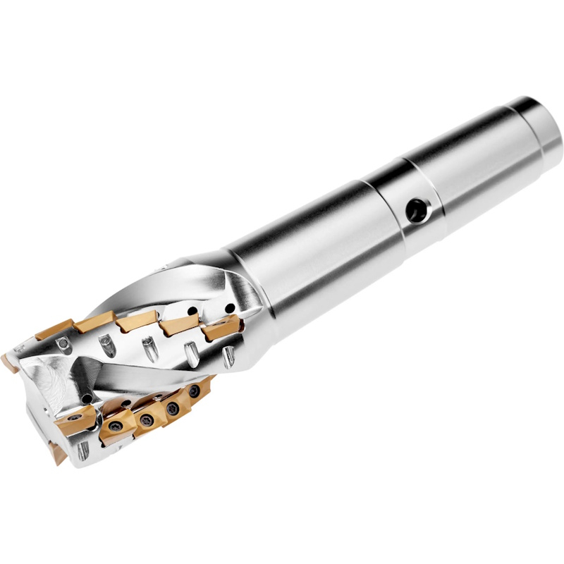 Shoulder mill with extended flute with positve/negative geometry which utilises AD.. 11.... single-sided inserts, through coolant for deep shoulder milling and deep slot milling.