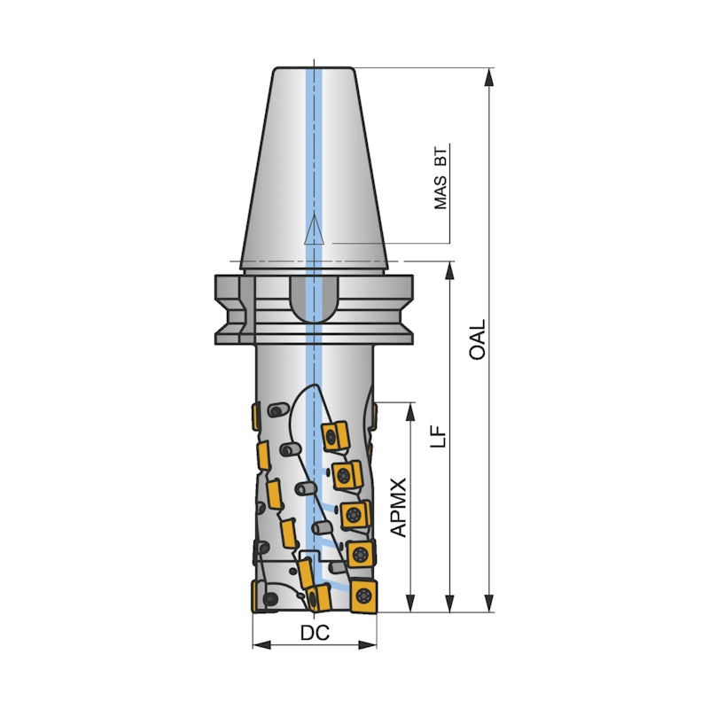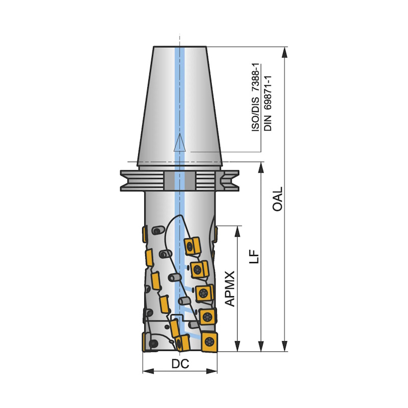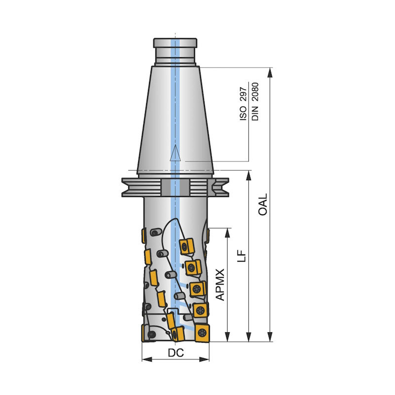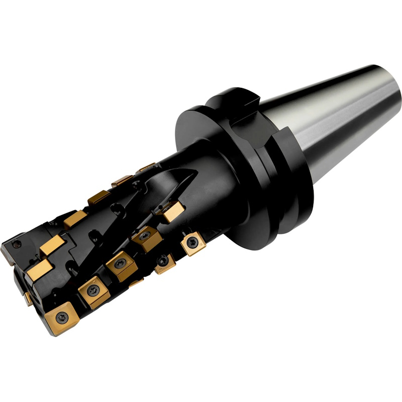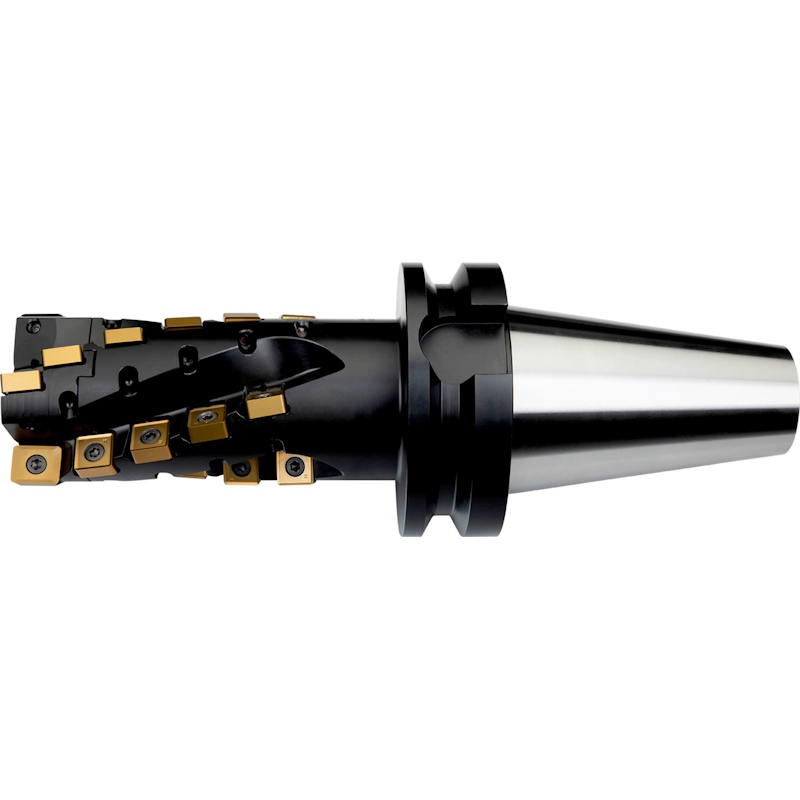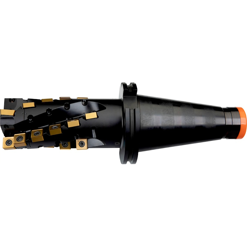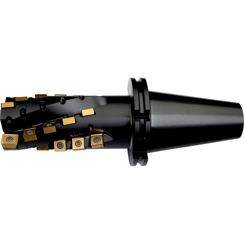 Shoulder mill with extended flute with double negative geometry which utilises LN.. 16.... and SN.. 1305.. double-sided inserts, through coolant for deep shoulder milling and deep slot milling
