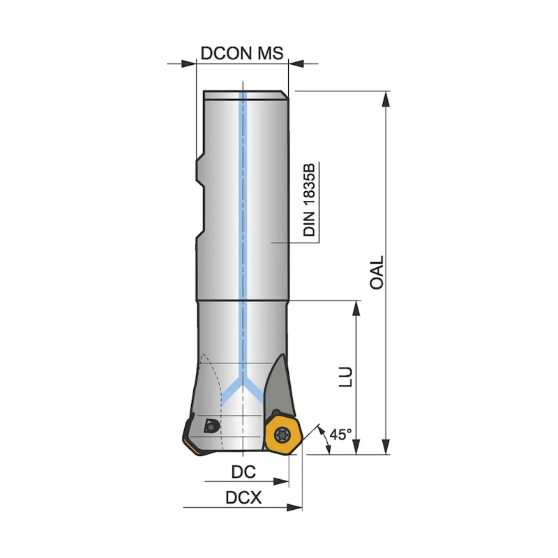 HN06 45° Face mill with double negative geometry which utilises HN.. 06.... or XN.. 06.... double-sided inserts, through coolant for face milling, ramping, progressive plunge milling and chamfering.