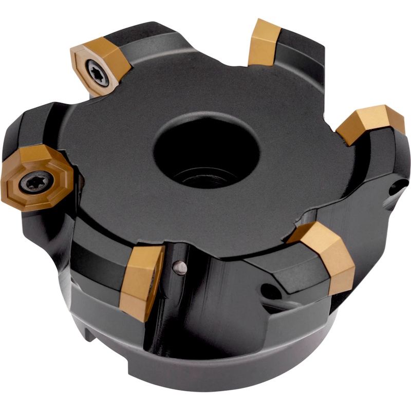 Face mill with positve/negative geometry which utilises 6 of OD.. 0605ZZ.. or RP.. 1505MO.. single-sided inserts. Through coolant and differential pitch for face milling and chamfering.