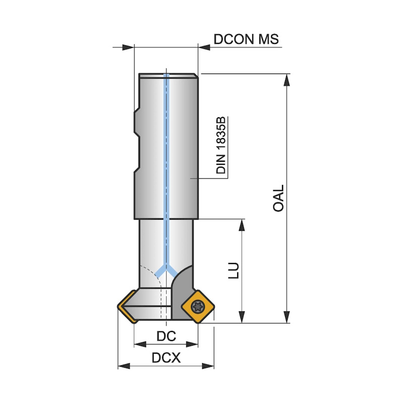 Chamfer mill with double negative geometry which utilises SO.. 09.... single-sided inserts, through coolant for chamfering.