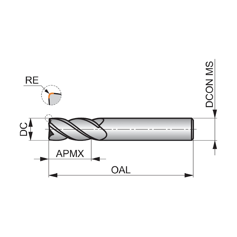 Medium cut length, 4-flute design with different corner radius available, 34° helix provides improved surface finish, when milling contours where a corner radius is requires. TiALN coating for higher temperature resistance and longer tool life.;TiAlN coating.