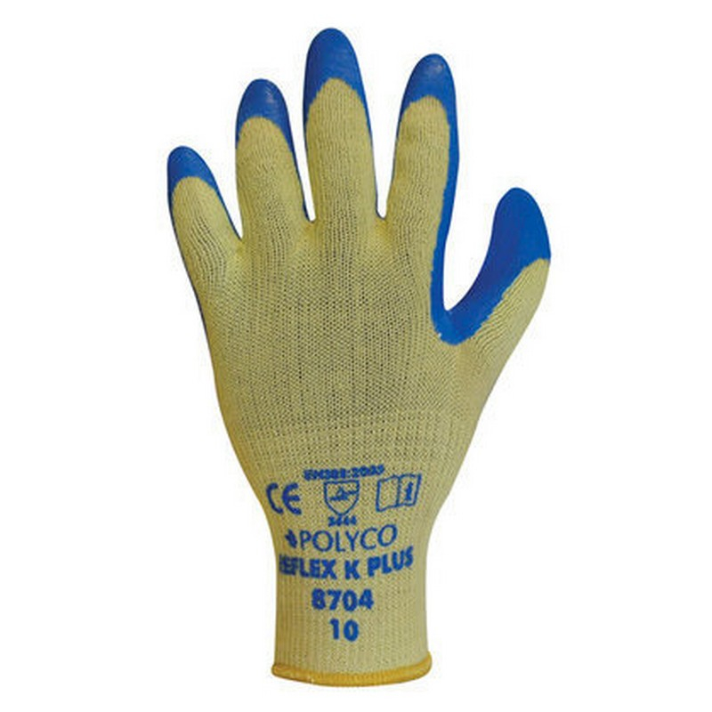 Reflex K Plus is a seamless knitted Kevlar liner with a crinkle latex palm coating providing excellent cut resistance and a secure grip. The high cut resistant Kevlar® liner offers outstanding protection from slashes, cuts and sharp objects yet is extremely comfortable. It is seamless thus avoiding irritation and is uncoated on the back of the hand allowing the hand to breathe. As well as providing excellent tear and puncture resistance, the crinkle latex palm coating provides outstanding grip in both wet and dry environments, and is exceptionally flexible keeping hand fatigue to a minimum in prolonged use. The elasticated knit wrist ensures a secure fit and keeps the hands free from dustand debris. The excellent protective properties and outstanding grip make this glove ideal for a wide range of tasks. Reflex® K Plus 3443 EN388